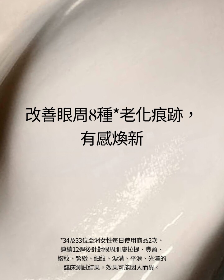 *34及33位亞洲女性每日使用商品2次、連續12週後針對眼周肌膚拉提、豐盈、皺紋、緊緻、細紋、淚溝、平滑、光澤的臨床測試結果。效果可能因人而異。